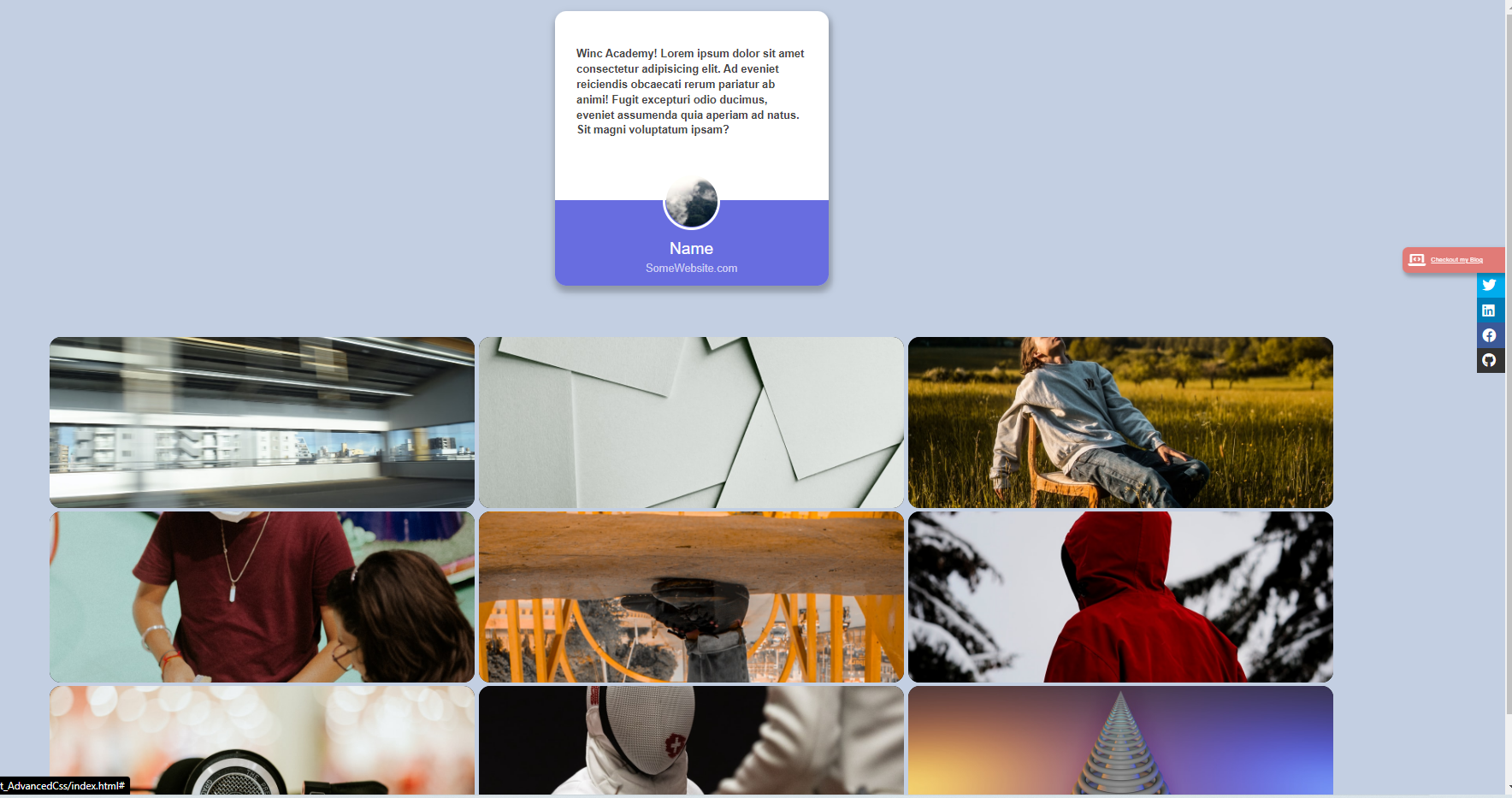 All projects so far: Module1 - Grid Practice Project Practicing a grid setup Module1 - Assignment - Advanced Css SASS, Grid, Animation etc.. Module1 - Assignment - Advanced Javascript Using advances Javascript concepts